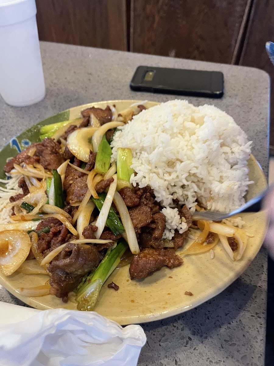 All I can say is wow. We randomly stopped by passing through on a trip and the amount of food for the price is insane. This will feed me for several days and price is about standard around where I live normally. Food was delicious. The beef skewers were outstanding. My husband got the beef mushroom dish and I got the red curry w/ chicken. The red curry was not the best I’ve ever had but better than many I would say I prefer the onions cooked more and that the sauce have more of the coconut milk sweetness but can’t be too picky at this price point. The milk tea w/rainbow jellies is my normal go to drink and that was also good.